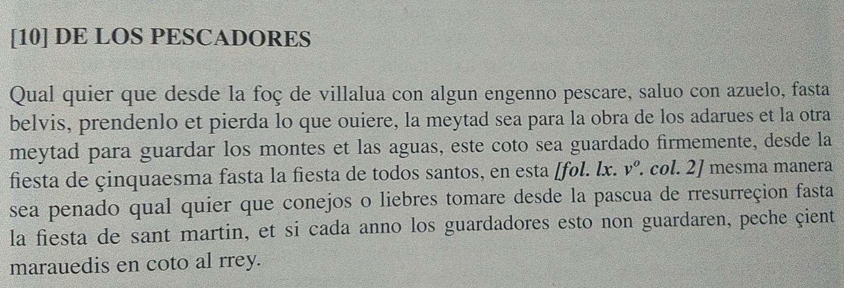 "Cualquiera que desde la Hoz de Villalba(Villalua), con algún engaño pescara salvo con anzuelo, hasta San Lorenzo de la Parrilla (Belvis),deténgalo y pierda lo que tuviere, la mitad sea...